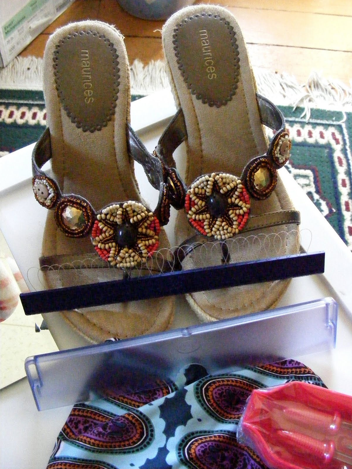 A pair of super cute sandals. They're a size too small, but I have such trouble finding sandals I like and that fit, and they're close enough to my size that I can live with them. These are also near new - the plastic size stickers on the bottoms are still there. They came from the same sale as the top.